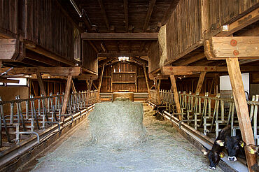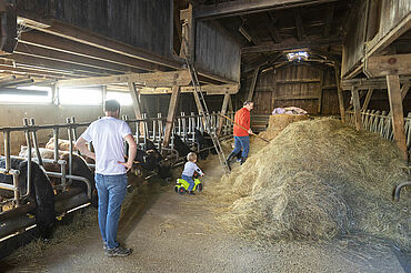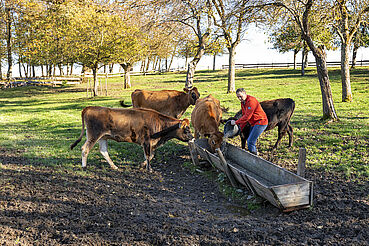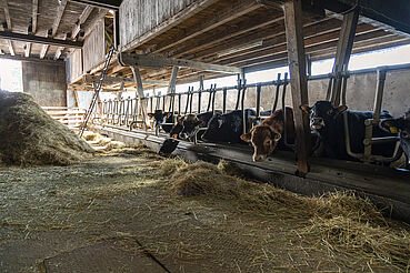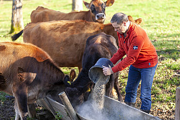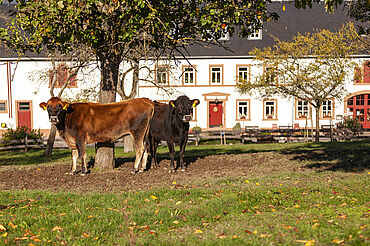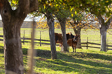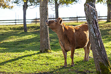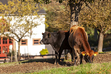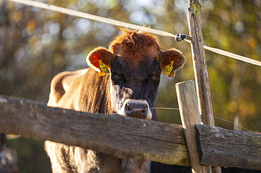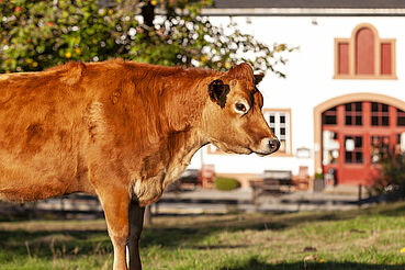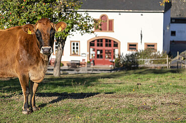 Auf rund 30 ha Grünland rund um den Hunolsteiner Hof weiden unsere 10 Jerseykühe in Ammenkuhhaltung. Besonders Kinder lieben die Möglichkeit auf dem Hof einen Blick in die Stallungen werfen zu können. Dort treffen Sie sicherlich eine unsere Katzen oder einen Trettraktor aus unserem Fuhrpark für Kinder.