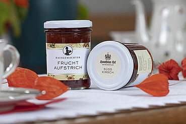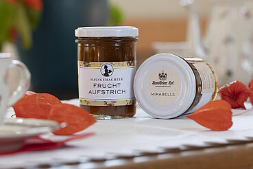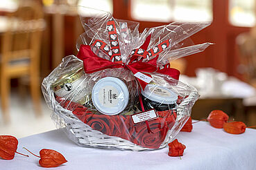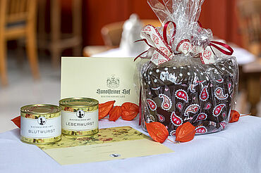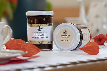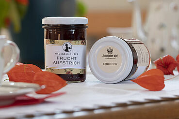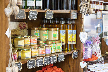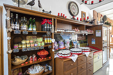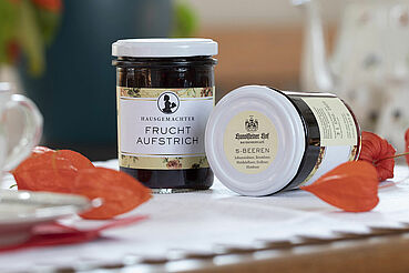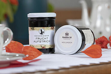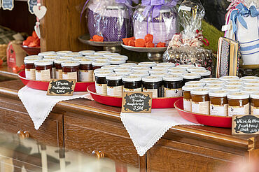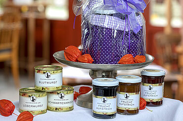 Für unsere Kuchen und Gerichte verarbeiten wir vieles, was auf unserem Hof wächst. Die Früchte unserer Streuobstwiesen werden nach eigenen Rezepturen zu köstlichen Fruchtaufstrichen, Gelees und aromatischen Likören verarbeitet. Unsere beliebten Hausmacher Wurstsorten Blut-, Leberwurst und Schwartenmagen werden exklusiv für uns von einer benachbarten Metzgerei mit eigener Schlachtung produziert. Darüber hinaus bieten wir eine reichhaltige Auswahl an regionalen Produkten, die sie in unserem Bauernhofcafé erwerben können. Gerne stellen wir Ihnen einen unserer Präsentkörbe für alle Gelegenheiten zusammen oder stellen Ihnen einen Gutschein aus. Sprechen Sie uns an!